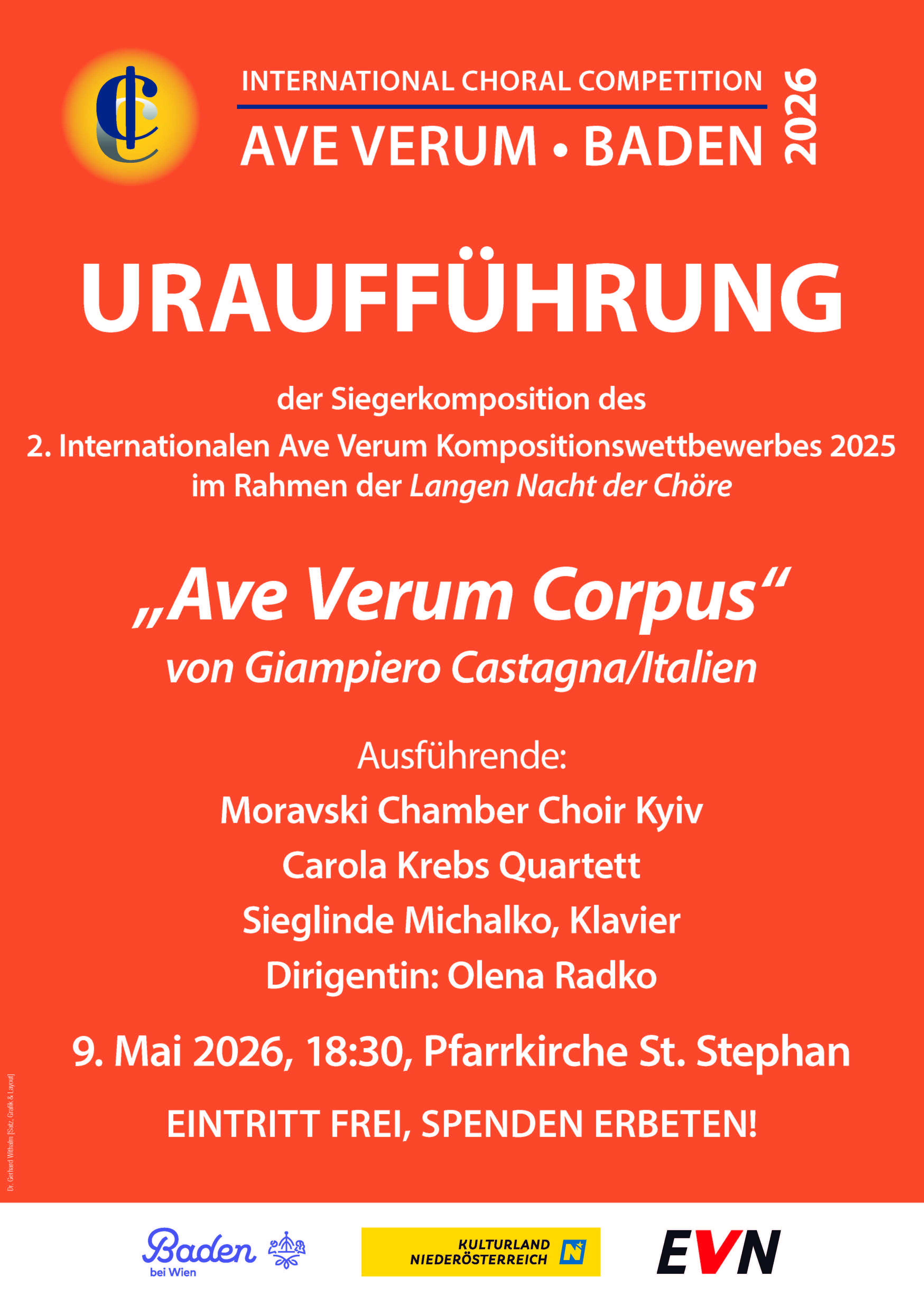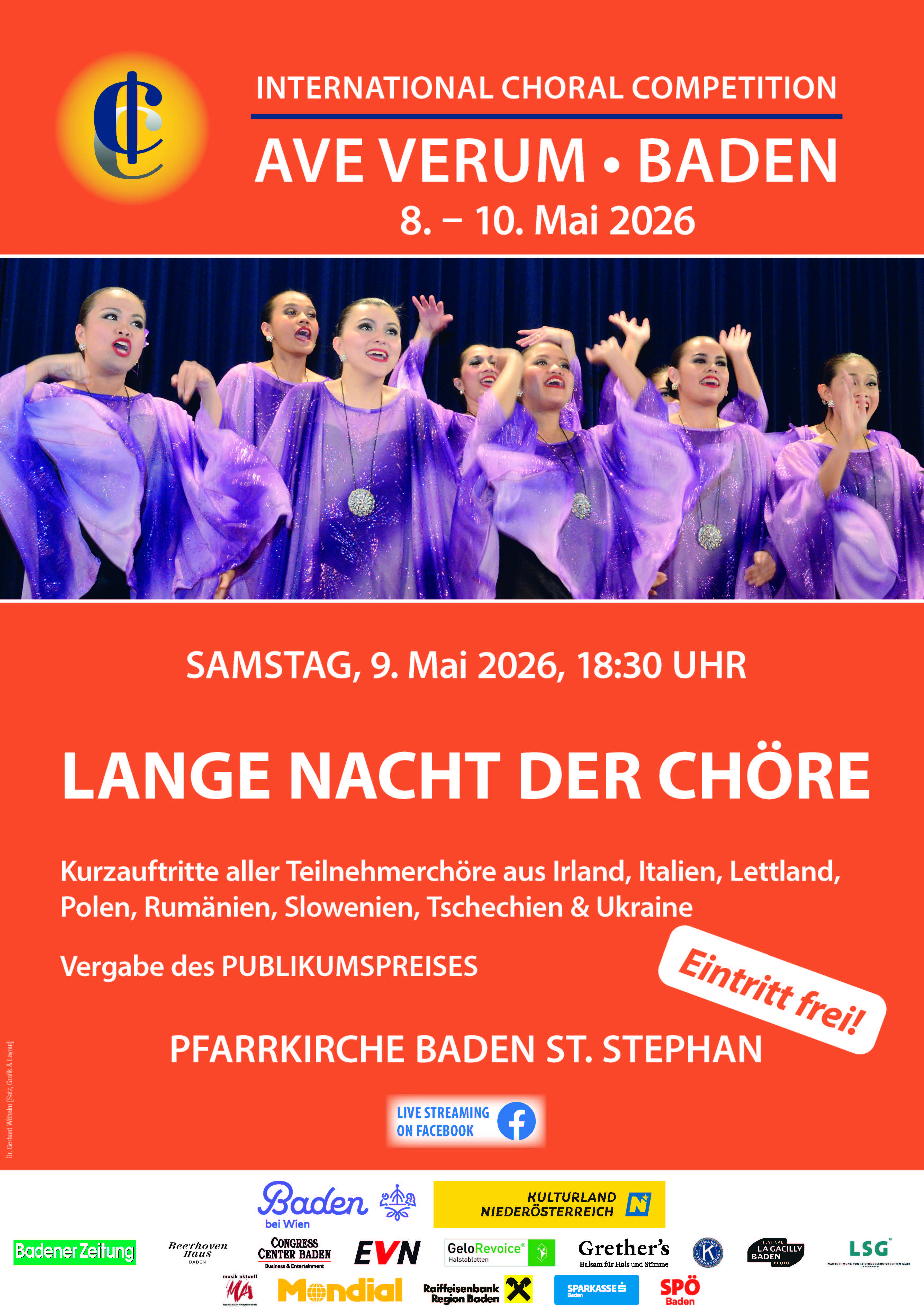 Ein Publikumsmagnet ist die „Lange Nacht der Chöre“, in der alle Chöre sich in einem facettenreichen Konzertabend präsentieren. Höhepunkt ist die Uraufführung des Siegerwerks des Internationalen Ave Verum-Kompositionswettbewerbs 2025, komponiert vom Italiener Giampiero Castagna, interpretiert vom Moravski Chamber Choir Kyiv, Ukraine und begleitet vom Carola Krebs Quartett und von Sieglinde Michalko, Klavier.